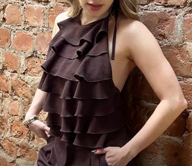 - Diseño: Se caracteriza por un cuello halter elegante que estiliza los hombros y un cuerpo con volantes en cascada.