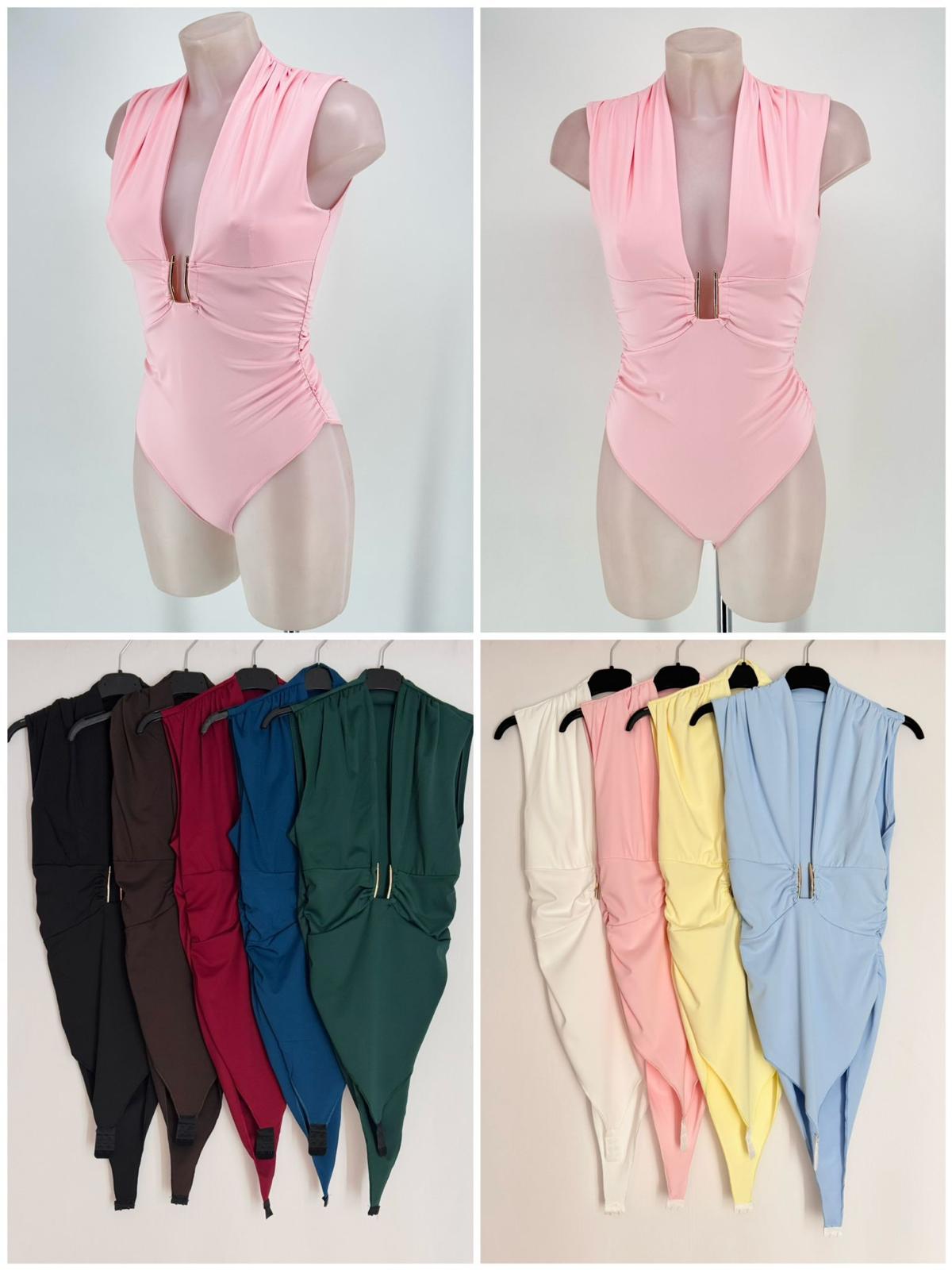 Body sin mangas con escote profundo, drapeado en la cintura y detalle de hebilla metálica frontal. Súper favorecedor, estiliza la figura y queda ideal tanto con vaqueros como con falda o pantalón de vestir. Disponible en varios colores.