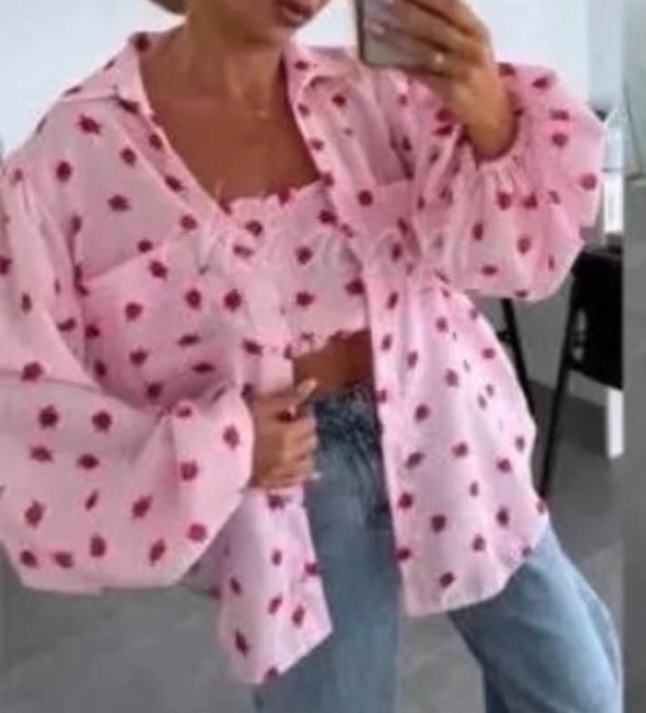 - Camisa: Una blusa de manga larga con cuello clĂĄsico y cierre de botones frontal. El diseño suele incluir hombros ligeramente caĂdos para un estilo mĂĄs relajado o «oversize».