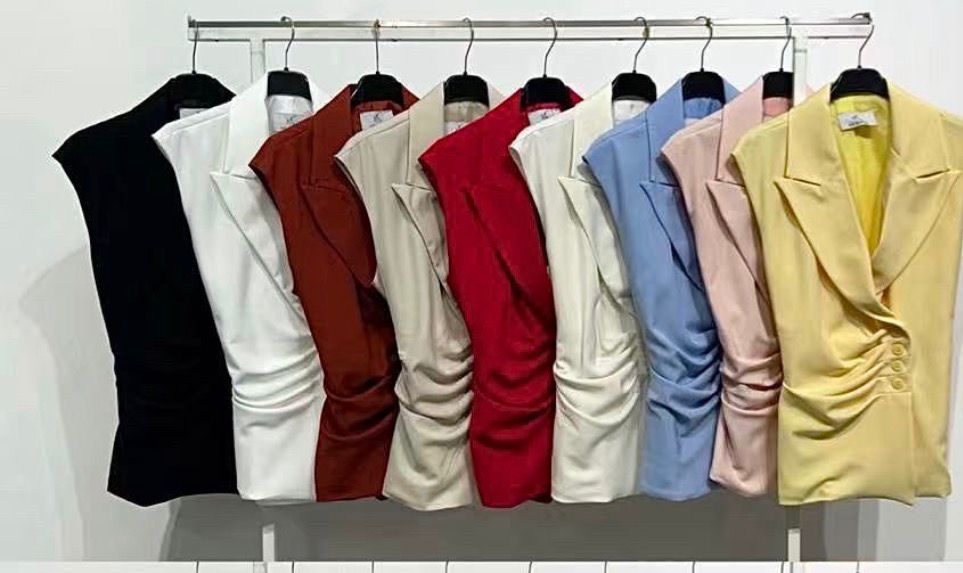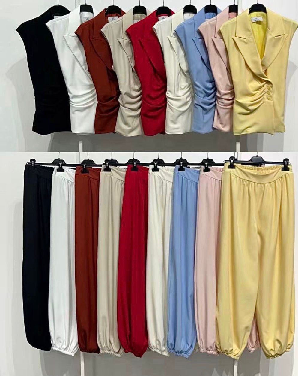 Esta imagen muestra un conjunto de moda compuesto por un chaleco con solapas y drapeado lateral junto con un pantalĂłn estilo bombacho a juego, disponibles en una variada gama de colores.