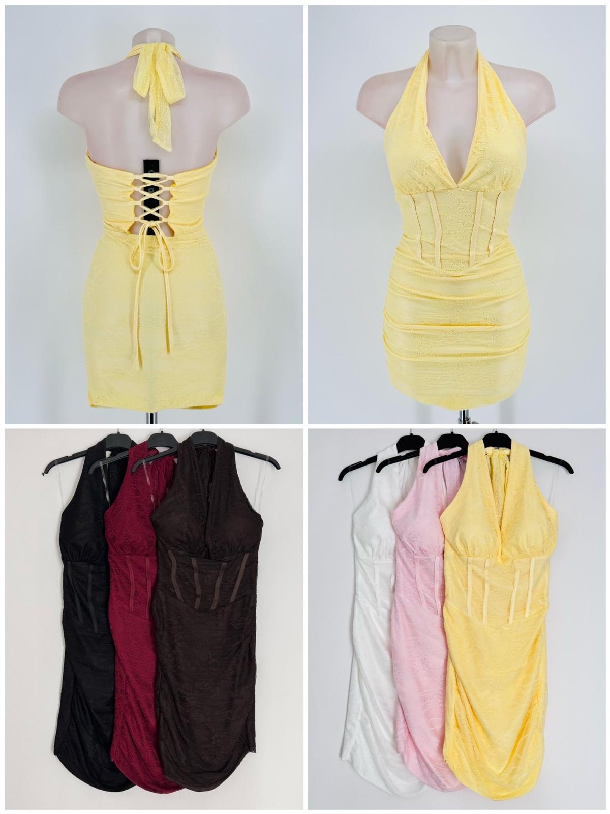 - Escote y Espalda: Presenta un escote en V profundo con cuello halter que se anuda detrås del cuello. La parte posterior cuenta con un llamativo detalle de cordones cruzados (estilo corsé) para un ajuste personalizado.