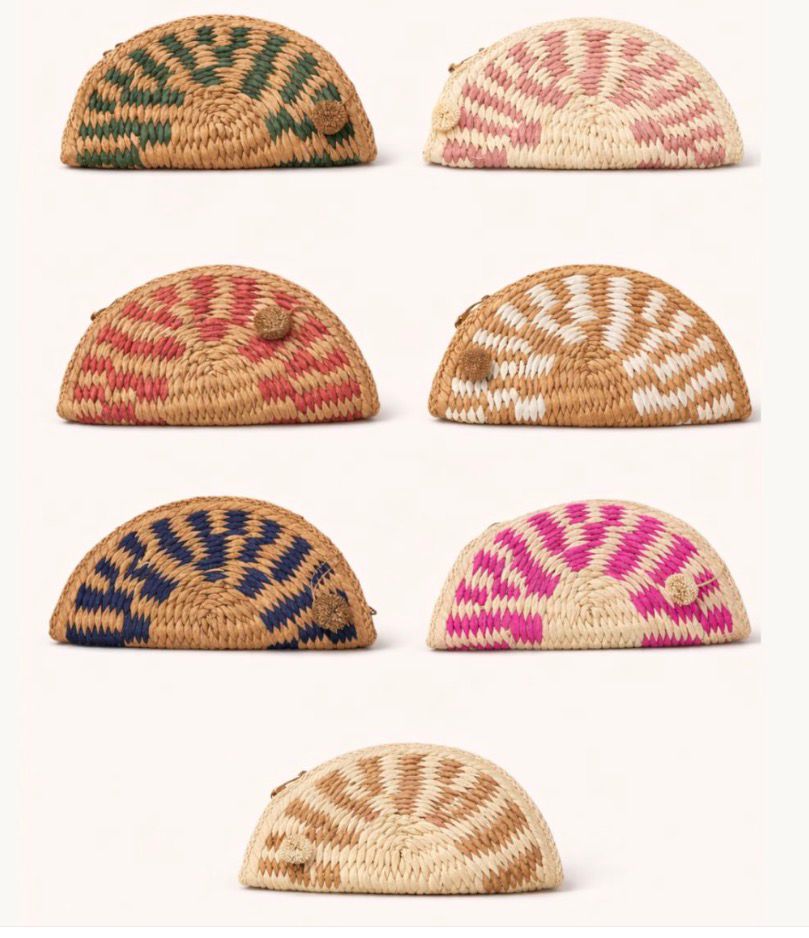 Tiene un diseño artesanal que combina la textura natural de la rafia con patrones geométricos en tonos vibrantes.