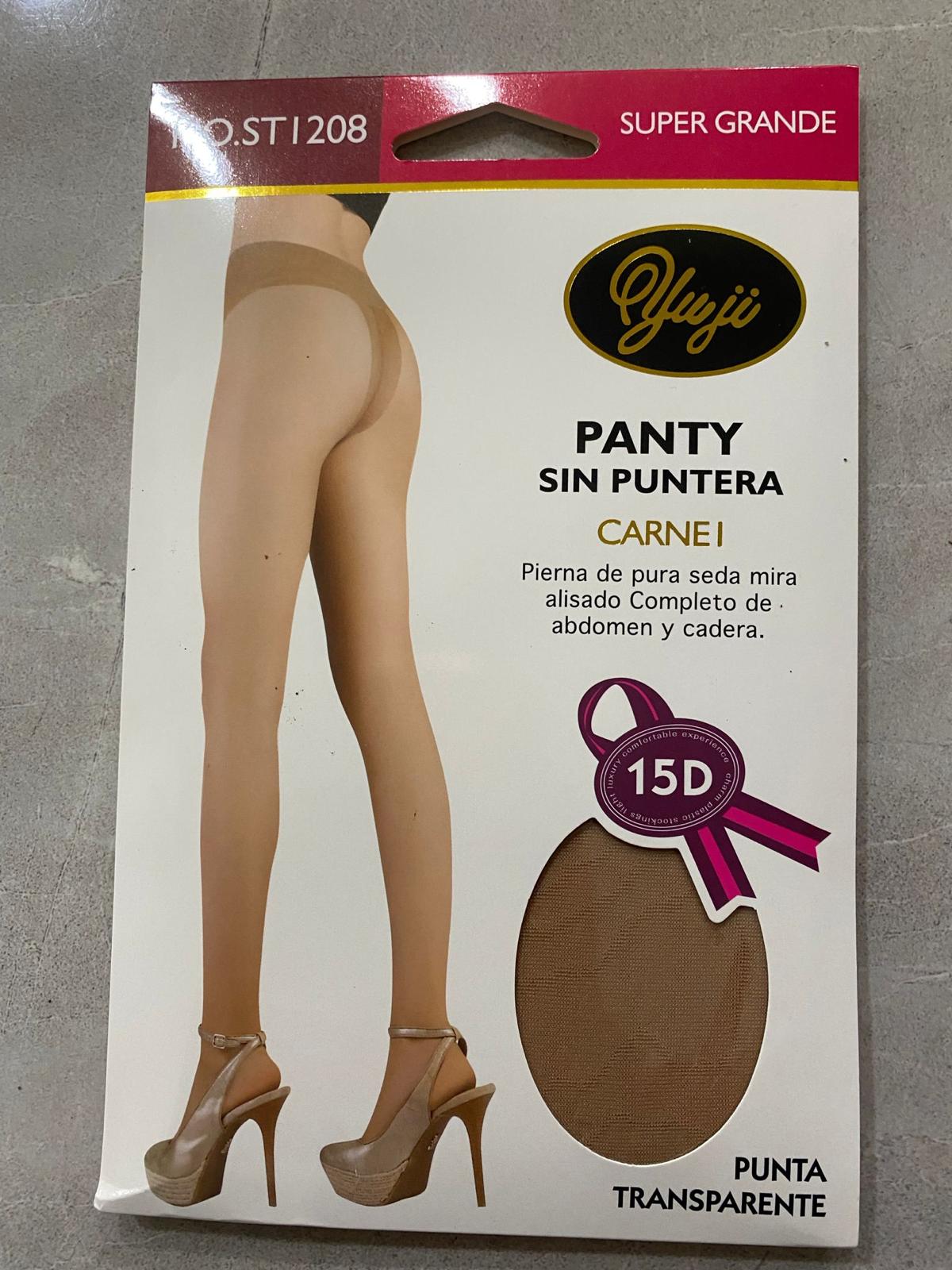 El producto que se muestra en la imagen es un panty sin puntera de la marca Yuji, especÃficamente el modelo NO. ST1208. Estas medias están diseñadas con una densidad de 15D (15 deniers) para ofrecer un acabado sedoso y natural, ideal para usar con zapatos abiertos.