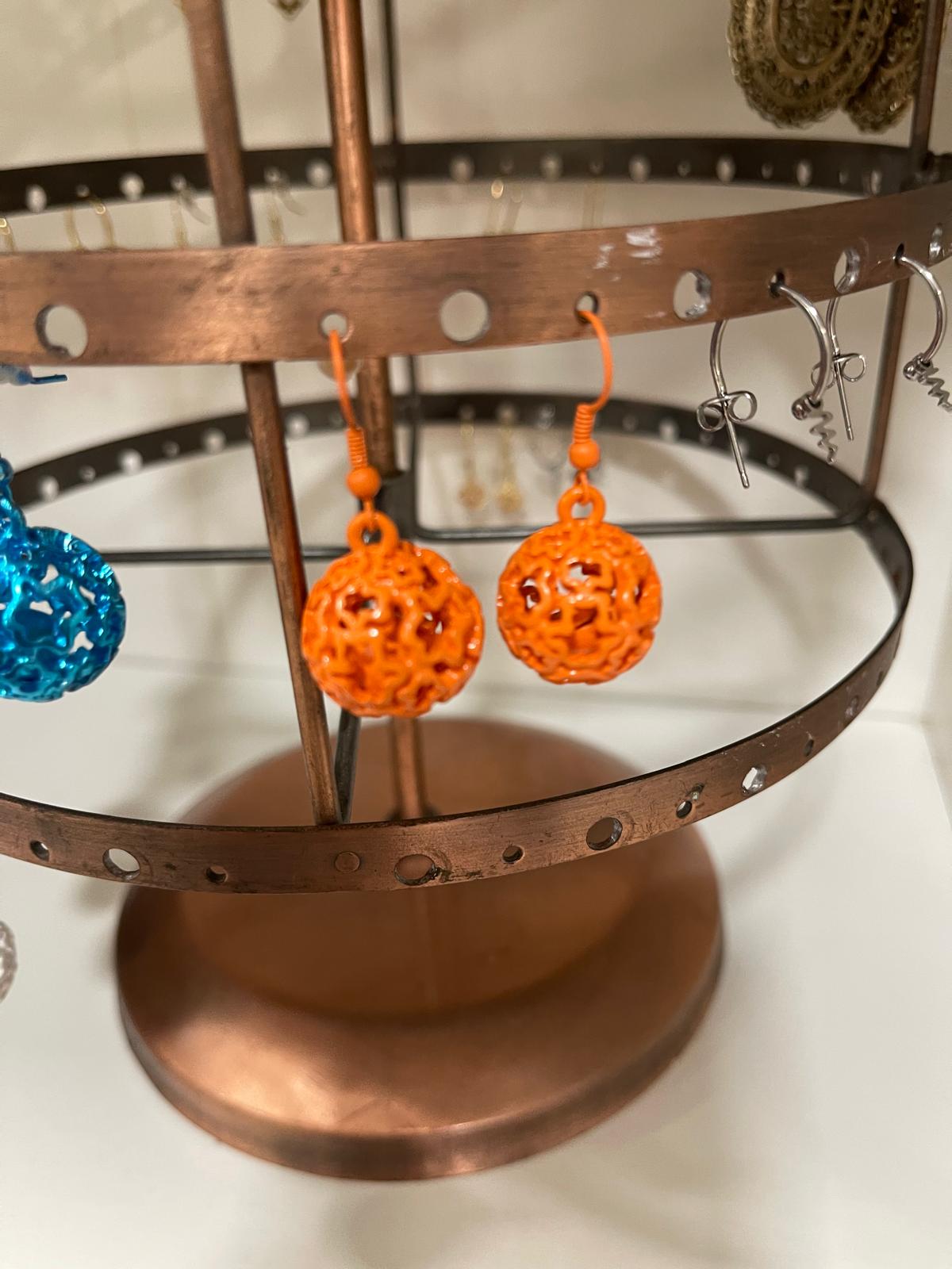 Los pendientes que se muestran en la imagen presentan un diseño de esfera calada o de «estilo nido», caracterizados por una estructura de filigrana o alambre entrelazado.