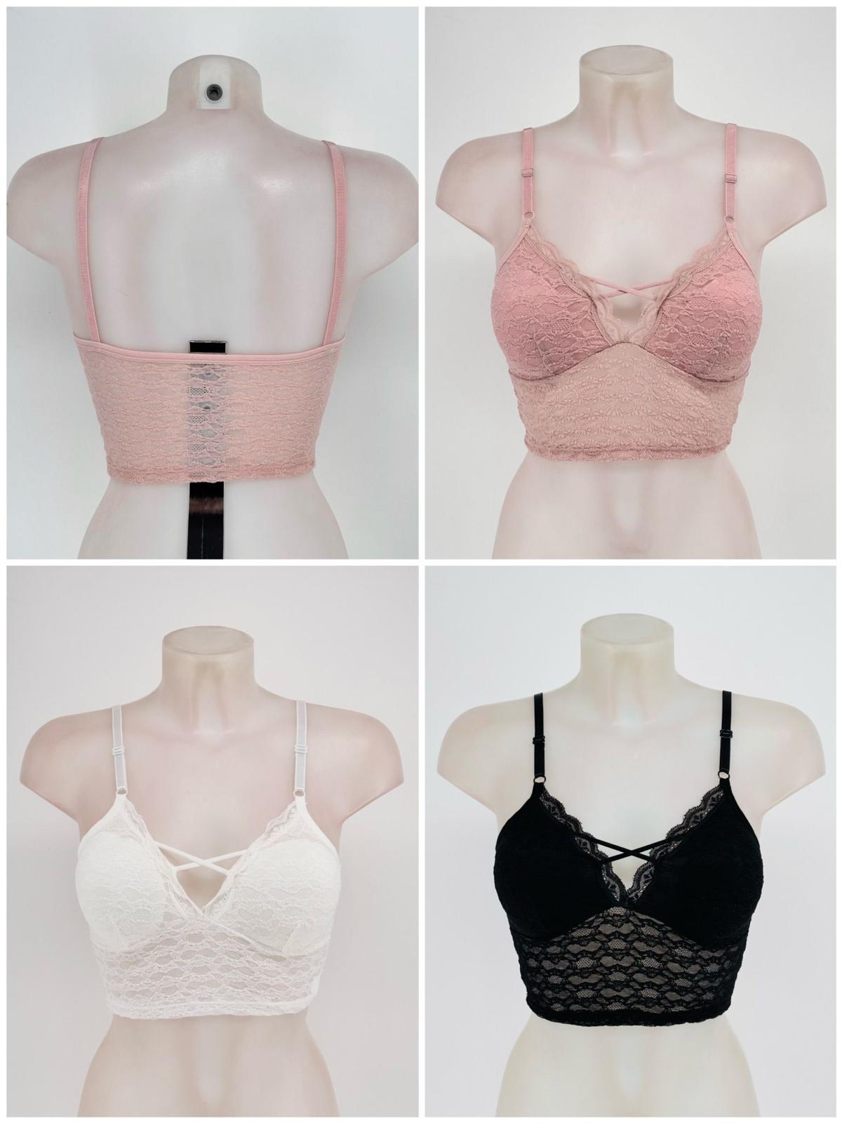 Este tipo de prenda es un bralette de encaje estilo longline (de corte largo) con detalles de tirantes cruzados en el escote y tirantes finos ajustables