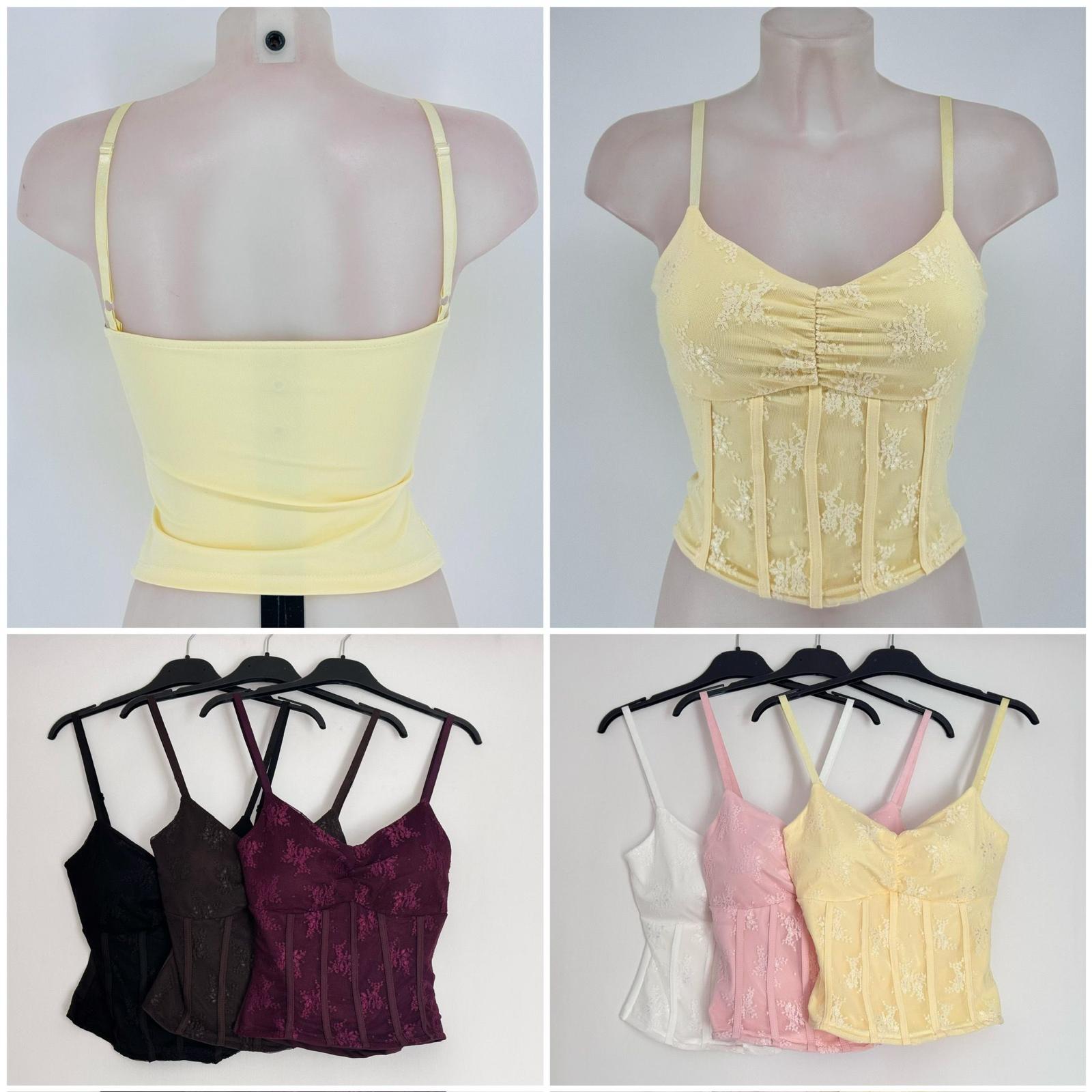 Con tirantes finos y detalles de encaje floral. Este tipo de prenda se caracteriza por su estructura entallada, a menudo con varillas visibles o costuras que imitan un corsé tradicional, y suele estar confeccionado en tejidos ligeros como malla o algodón con superposiciones de encaje