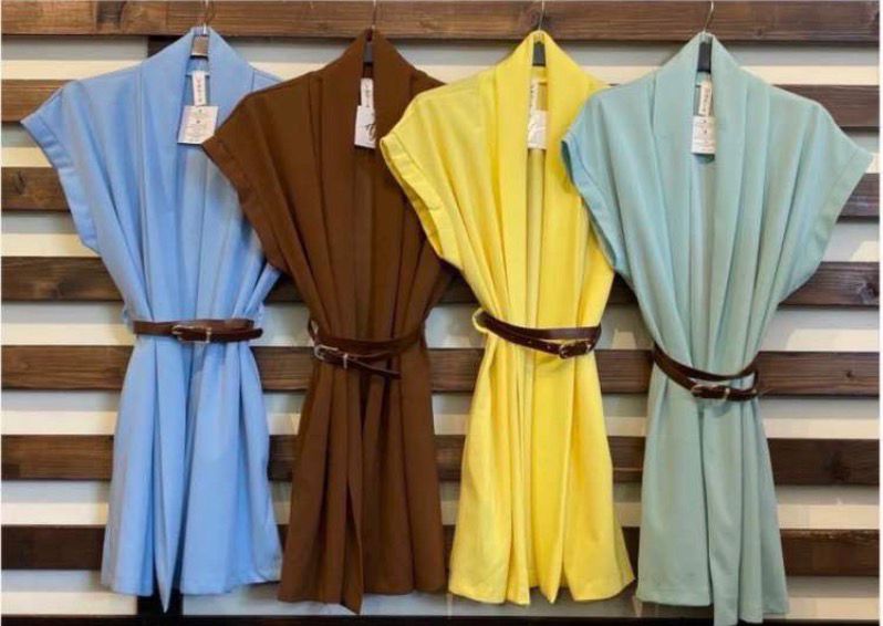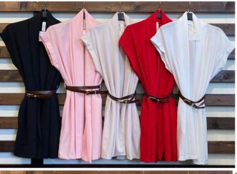 Es una pieza versátil que suele presentar un diseño de manga corta o sisa, cuello tipo kimono o solapa, y se acompaña de un cinturón fino, a menudo de polipiel, para ajustar la cintura.