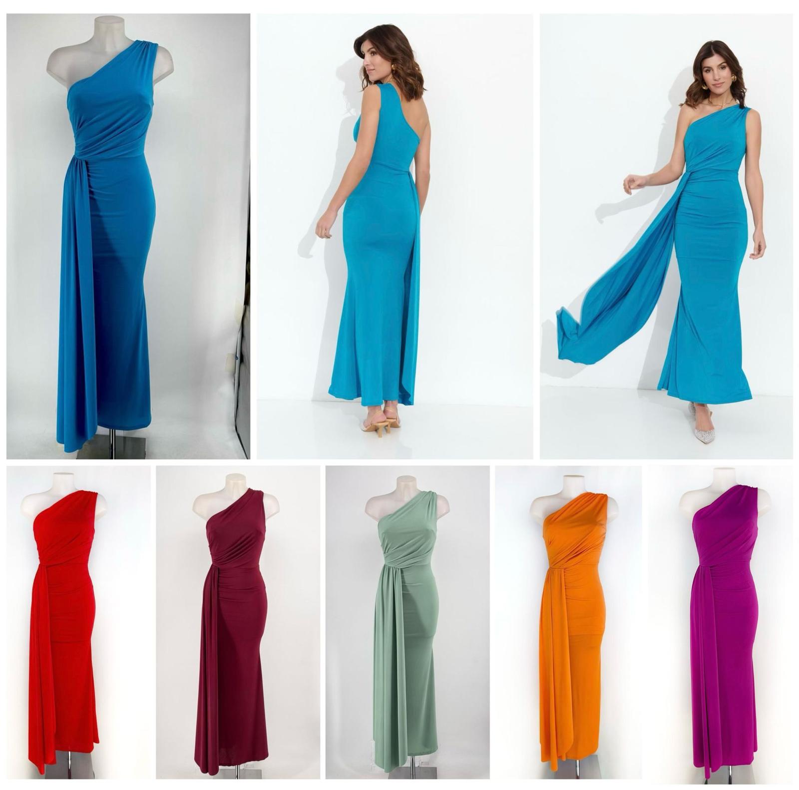 El vestido que se muestra en la imagen es un modelo largo de fiesta con diseño asimétrico, caracterizado por un escote de un solo hombro y un elegante drapeado en la cintura que fluye hacia una capa lateral.